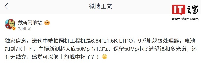 据IT之家此前援引博主 @数码闲聊站 消息,某厂迭代中端拍照机工程机配备 6.84 英寸左右 1.5K LTPO 屏幕,搭载 9 系旗舰级处理器,同时电池也会加到 7000mAh 上下。新测超大底 50Mp 1/1.3"± 镜头,同时保留 50Mp 小底潜望镜和多光谱镜头,预计为 nova 16 Ultra / Pro Max。