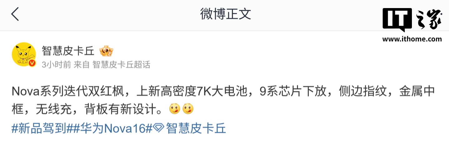 IT之家 4 月 12 日消息,博主 @智慧皮卡丘 今天在微博透露,某厂的 nova 系列迭代机型将搭载双红枫镜头、上新高密度 7K 大电池。