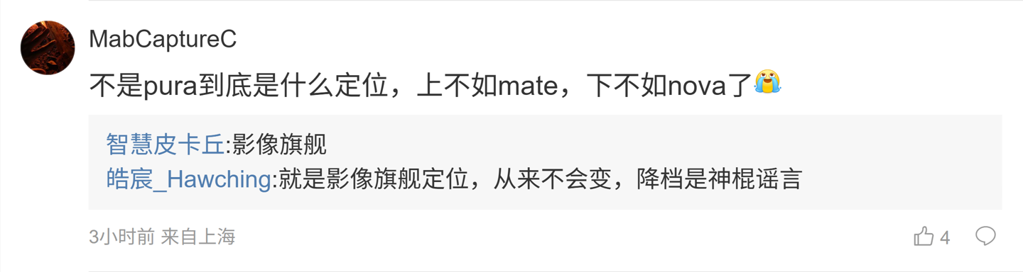 后续有用户在评论区询问:“🌸接下来会用回曲屏吗?”,博主回复道:“主线不会”;另一名用户则询问道:“不是 pura 到底是什么定位,上不如 mate,下不如 nova 了”,博主则回复道:“影像旗舰”。